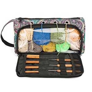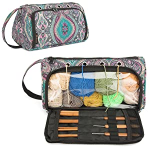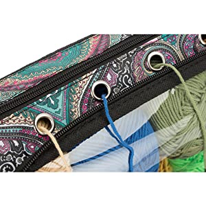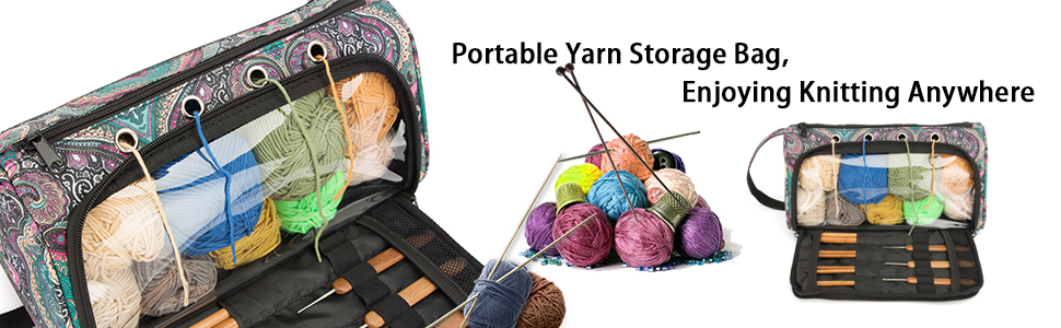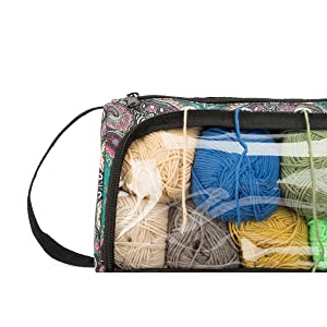 Гэтая сумка для захоўвання пражы складаецца з 1 асноўнага аддзялення для захоўвання 9 моткоў баваўнянай пражы даўжынёй каля 130 ярдаў, 1 вялікай кішэні на спіне& 1 пярэдні кішэню для размяшчэння да 10-цалевых спіцы, нажніц, кручкоў і іншых інструментаў для вязання.