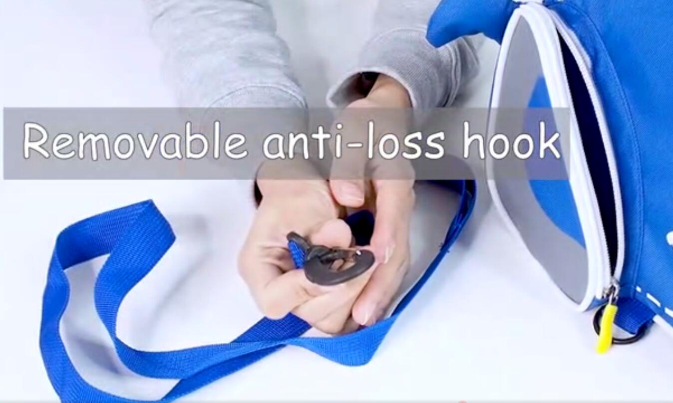 2.取り外し可能なアンチロスフックにより、お子様は安全な距離を保ち、 キッズバックパックのフロントジッパー式ポケットに簡単に収納できます